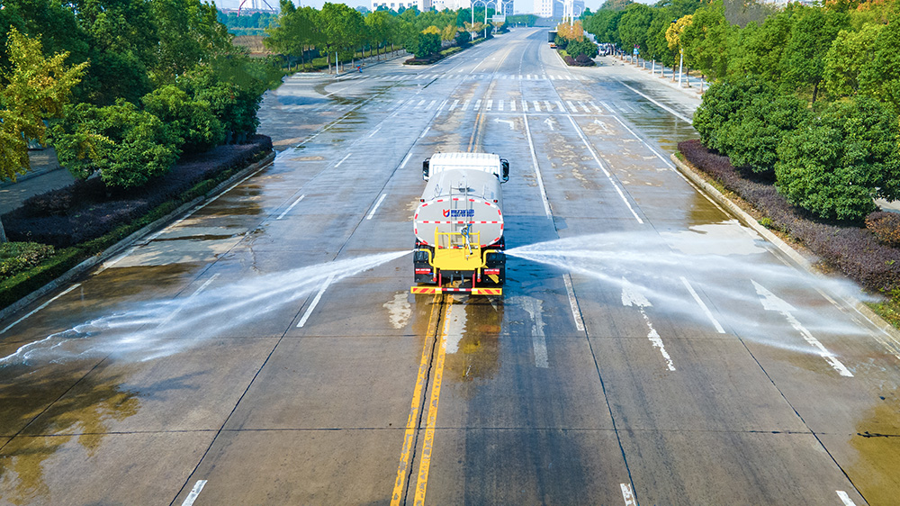 产品标配前冲、后洒、侧喷、后置式工作平台、平台上有高压水炮(可 360°旋转,水雾形状可调成直冲状、 大雨、 中雨、 小雨、毛毛雨;调成直冲状**射程≧ 35 米,也可调成雾状**射程≧15 米)、配备优质大功率专用洒水泵,品牌取力器、杂物过滤网、国标通用 65 型消防接口(可通过消防栓加水)、1 套自流球阀系统(可自吸自排,**吸程 7 米)、2 根引水钢丝胶管。适用于各种路面清洗;树木、绿化带、草坪绿化;道路、厂矿企业施工建设、高空建筑冲洗。具有洒水、压尘、高(低)位喷洒、农药喷洒、护栏冲洗、应急消防等多种功能。