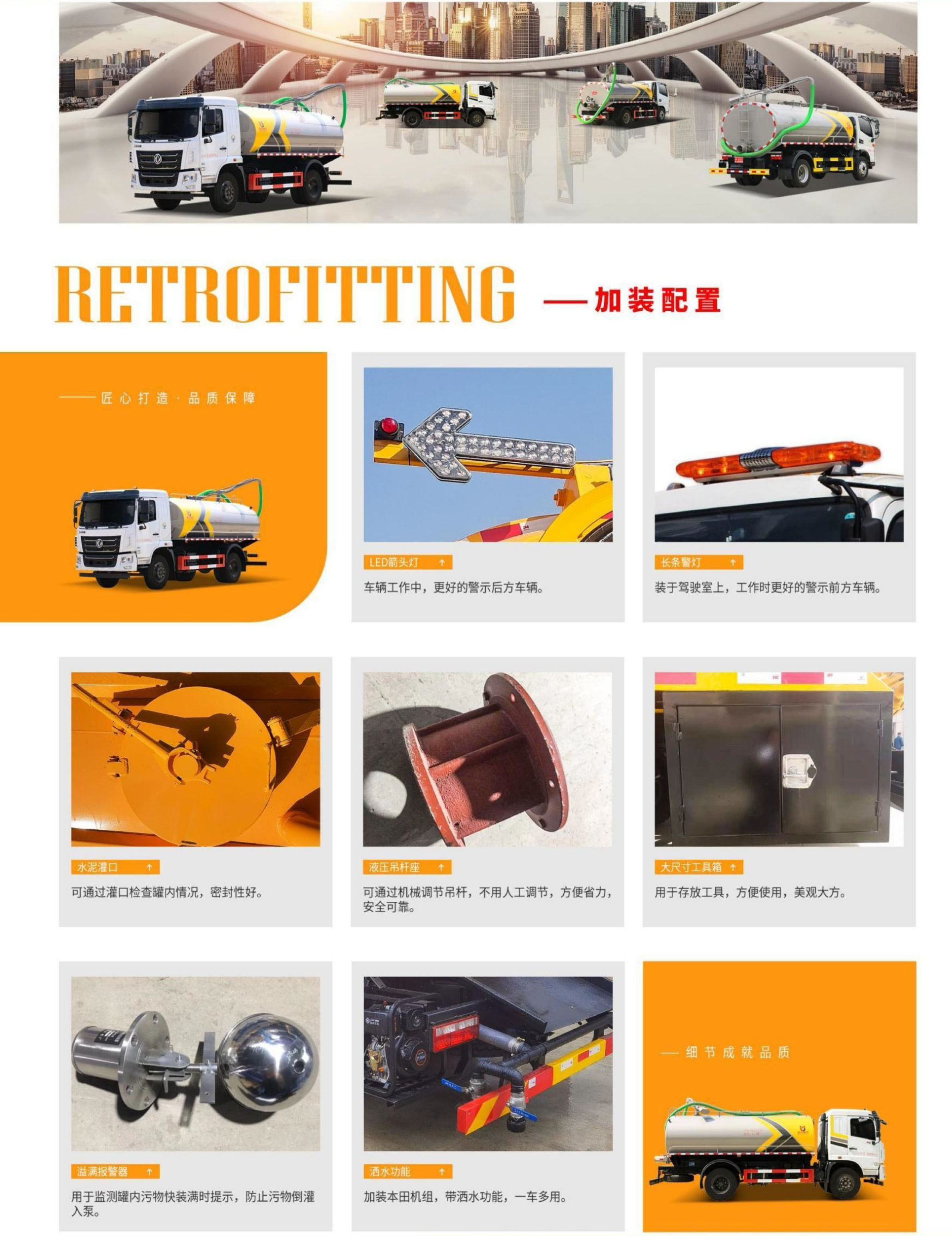 上装配置 | 罐体容积2.4立方米,罐体外形尺寸长×长轴×短轴 (mm):2600×1300×900。罐体采用武钢优质碳钢制作,厚度 6mm,带洗手装置,带加粗型污水观察管,吸粪灌口(1个) 带DN200蝶阀,配备3T油泵,水油分离器,防溢阀,吸粪吸污 管8米1根,带360度旋转吊杆座,尾部8寸排污口。 | |